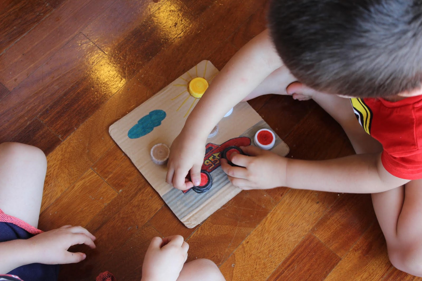 Abrir e fechar a tampa de uma garrafa é uma excelente atividade para desenvolver a motricidade fina. Com este jogo, com o pretexto de mudar os pneus do carrinho vermelho mais famoso cá de casa, fazemos disso uma brincadeira :)